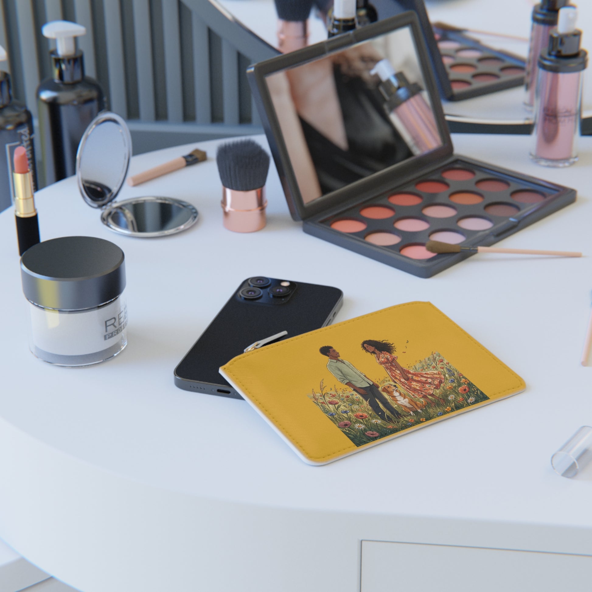 Mini Clutch Bag — Romantic Couple & Dog Illustration on Mustard