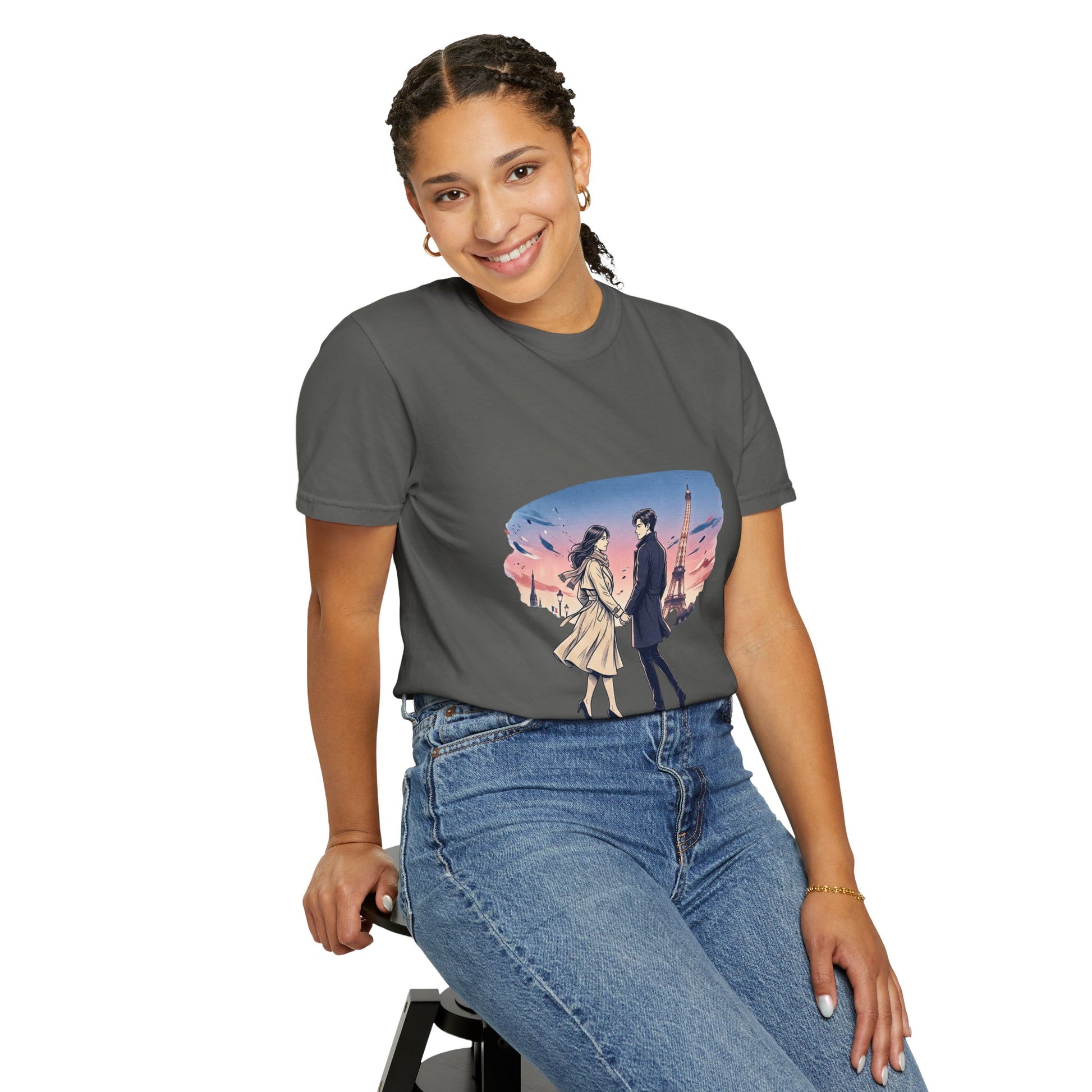 Paris Sunset Romance T-Shirt — Couple Walking by Eiffel Tower Graphic Tee